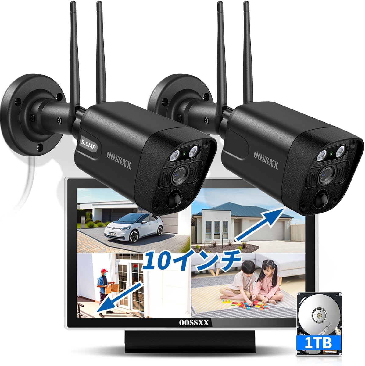 【双方向通話・ダブルアンテナ信号強化・130° 超広角】 OOSSXX 防犯カメラ ワイヤレス 室内 屋外 3K 500万画素2台 ホームセキュリティー 監視カメラ 24時間録画 録画機能付き モニター付き 黒 (10インチ2台セット(1TB HDD))(新型10インチモニターへ更新中)